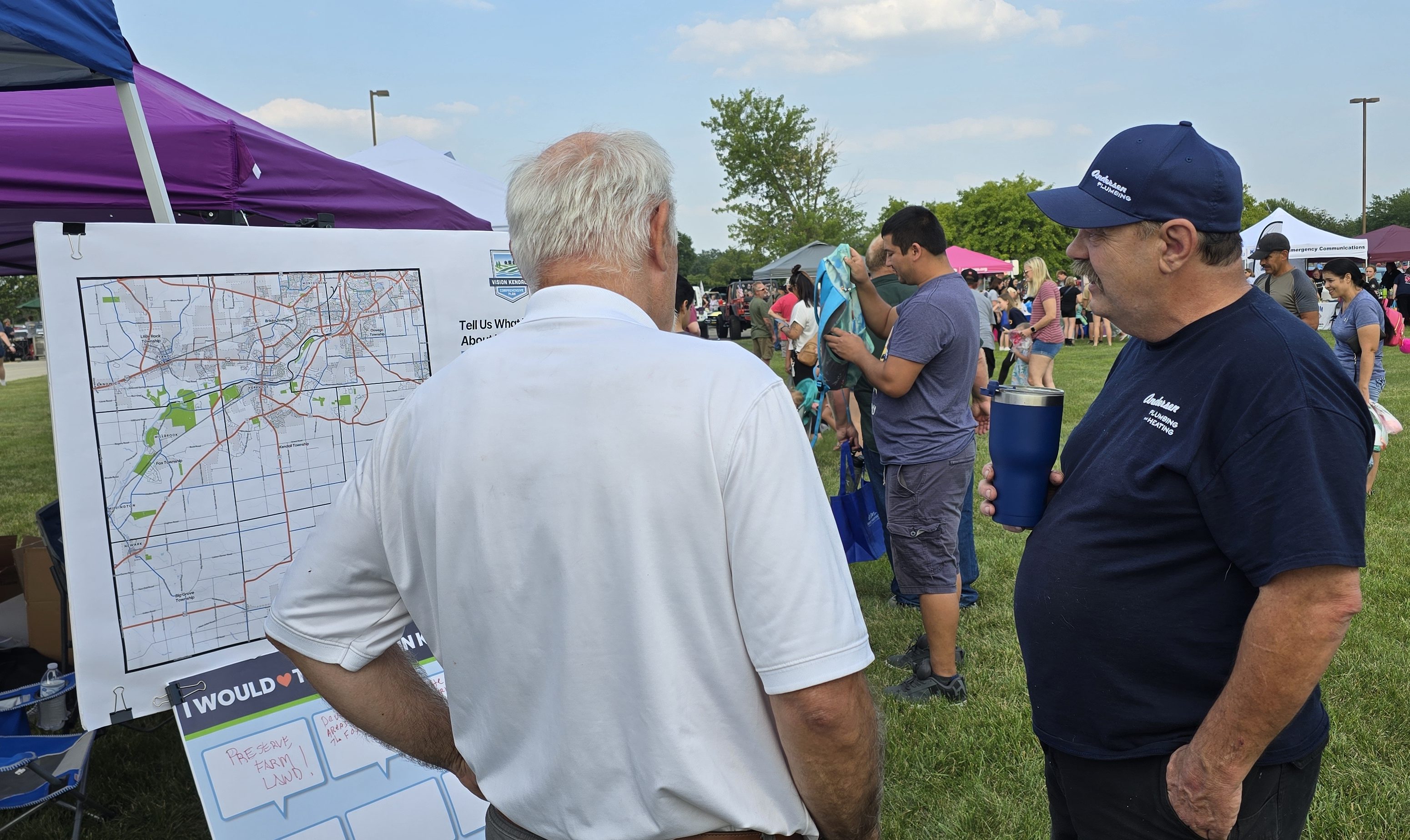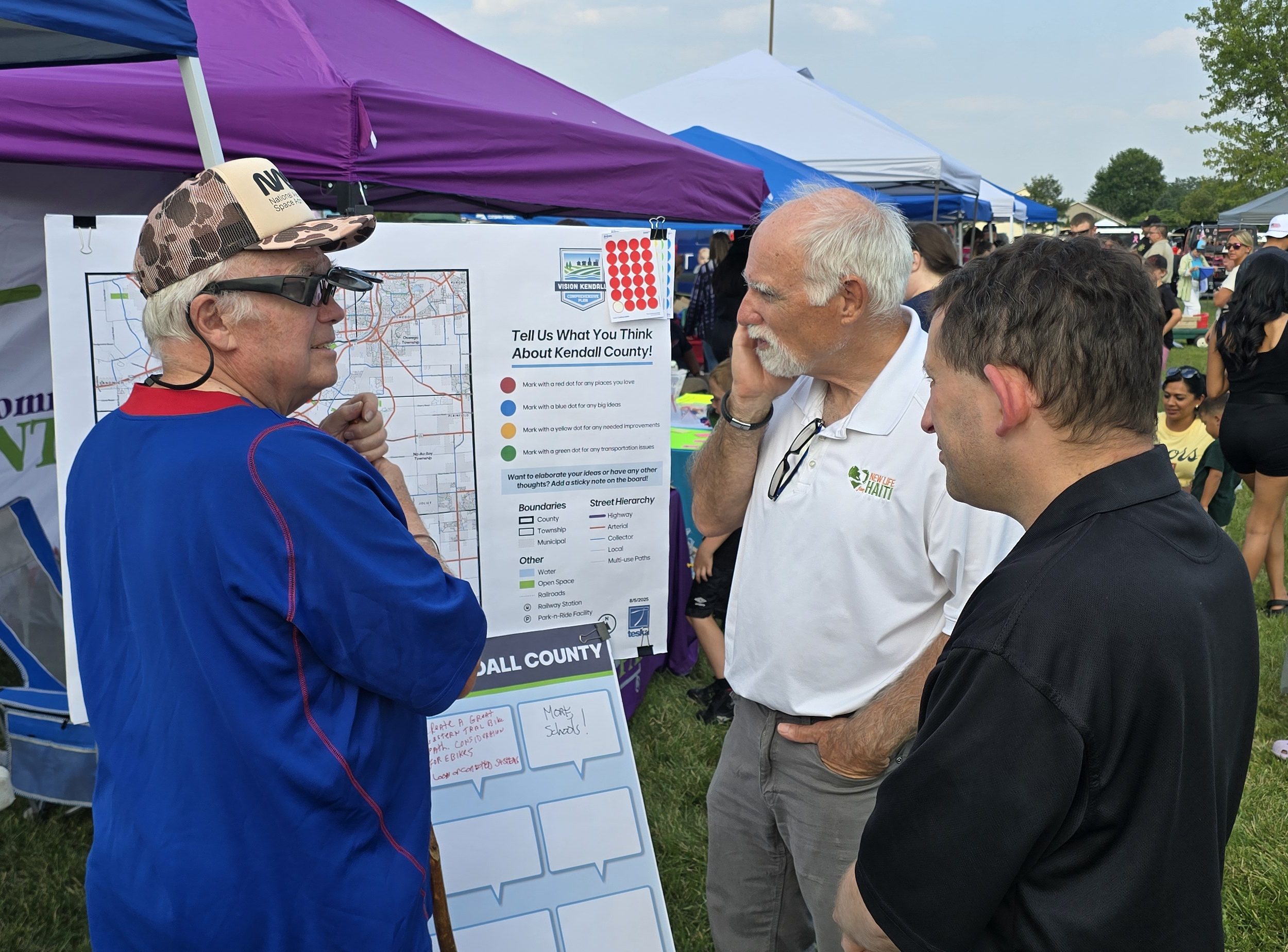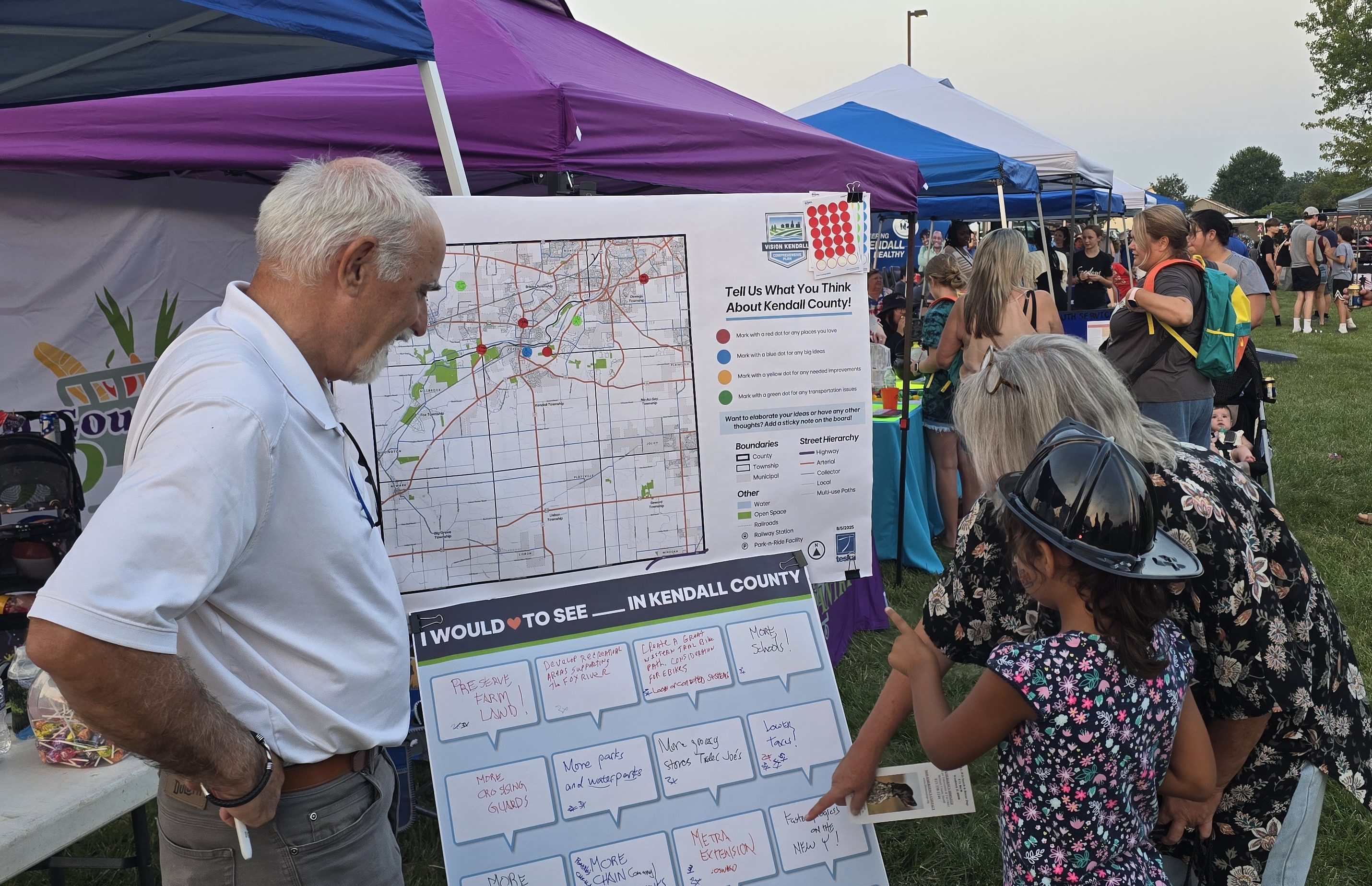 The booth featured two interactive boards: one inviting written comments on what people want to see in Kendall County, and another with a county map where visitors marked places of interest using colorful stickers. We’d like to extend a big thank you to everyone who stopped by and shared their thoughts!